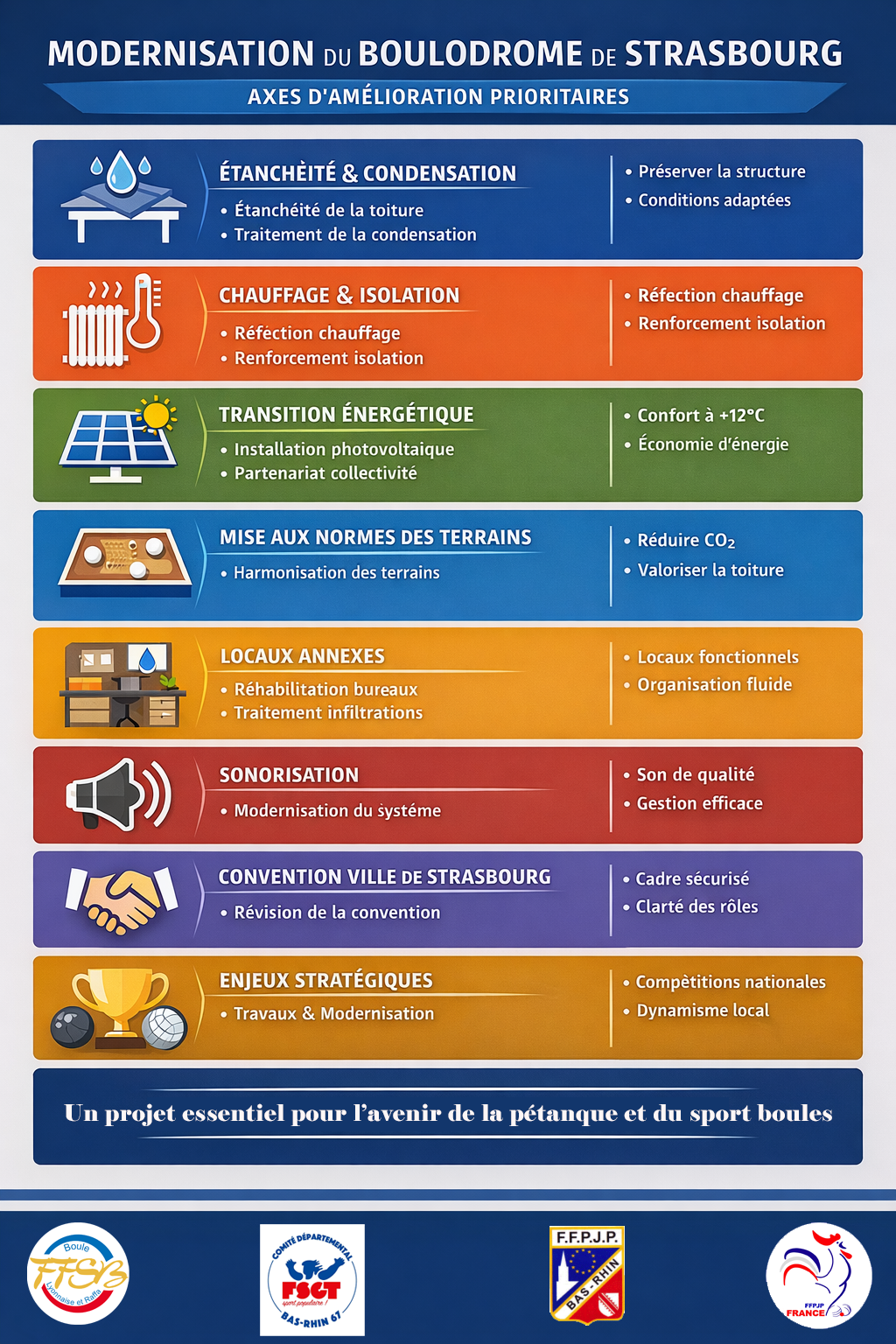 Pour continuer à faire vivre la pétanque et le sport boules à Strasbourg, des travaux et des aménagements sont indispensables :