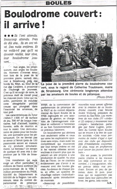 Nous remercions Catherine Trautmann et Mourad Oualit pour leur visite, leur écoute et l’attention portée à l’avenir du boulodrome. Une copie d’archive d’un article des DNA a été remise, retraçant la pose de la première pierre du boulodrome, en présence de Catherine Trautmann Maire de Strasbourg à l’époque.